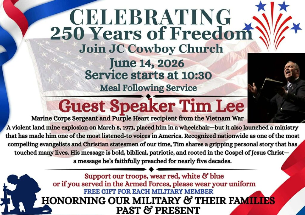 Guest Speaker Tim Lee, Marine Corps Sergeant and Purple Heart recipient from the Vietnam War is recognized as one of the most compelling evangelists and Christian statesmen of our lifetime. Tim shares a gripping personal story of a violent land mine explosion that launched the ministry he proclaims as bold, biblical, patriotic, and rooted in the gospel of Jesus Christ.